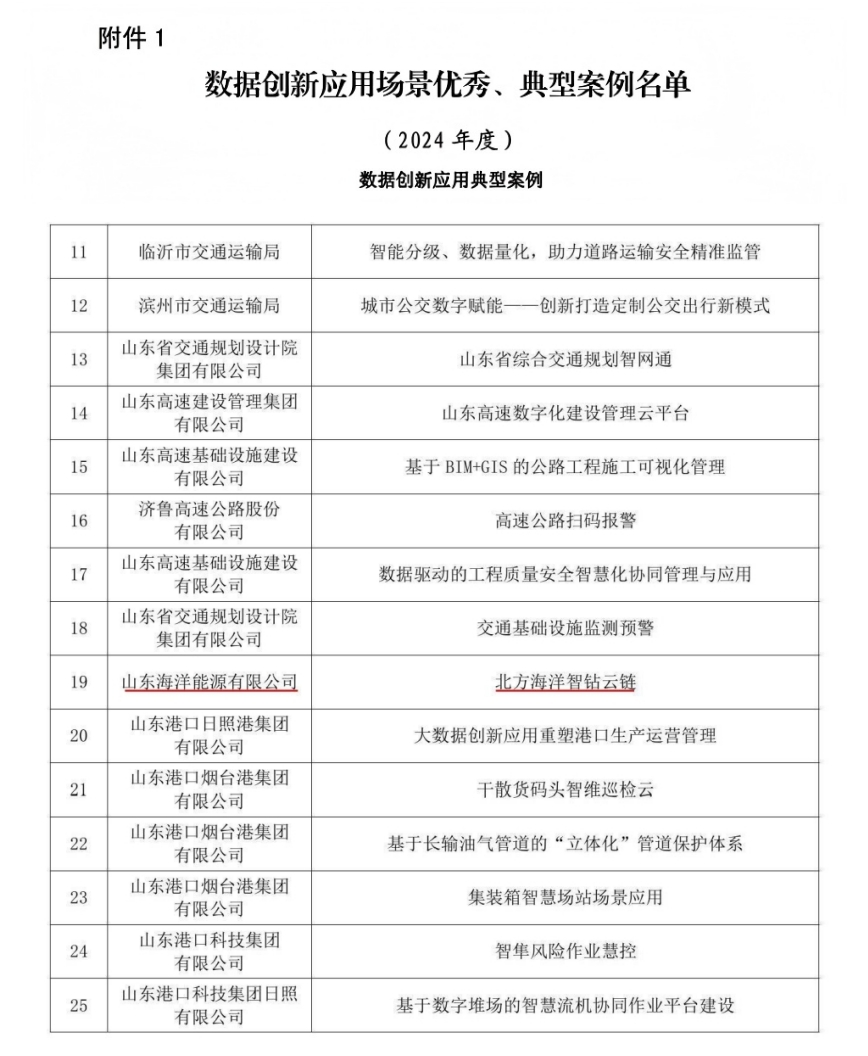 近日,山東海洋能源申報(bào)的“北方海洋智鉆云鏈”數(shù)字化應(yīng)用場(chǎng)景,成功入選山東省交通運(yùn)輸廳2024年度全省交通運(yùn)輸行業(yè)數(shù)據(jù)創(chuàng)新應(yīng)用典型案例。