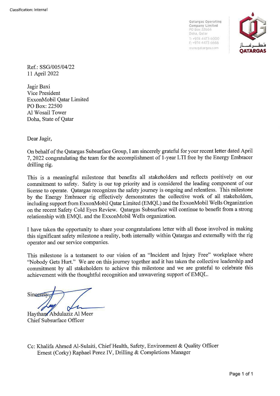 ??松梨谑凸驹谫R信中表示,安全第一是鉆井平臺(tái)作業(yè)的必要條件,“一年來(lái)無(wú)損工事件”是一個(gè)具有深遠(yuǎn)意義的標(biāo)志,它代表著北方鉆井兌現(xiàn)了在安全管理上的鄭重承諾。埃克森美孚石油公司衷心感謝北方鉆井全體員工的辛勤付出,并表示這是該鉆井平臺(tái)保持良好作業(yè)效率和業(yè)績(jī)的體現(xiàn),也是項(xiàng)目相關(guān)方共同努力的結(jié)果。