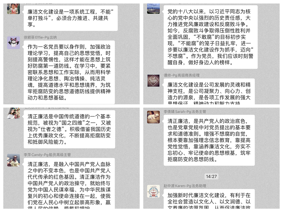 近期,太平洋氣體船黨支部通過網(wǎng)絡開展了“廉潔文化云上談”主題黨日活動。利用公司黨員微信群的平臺,黨員們結(jié)合集團公司“廉潔文化大家談”欄目稿件征集工作要求,紛紛暢談了自己對“廉潔文化”建設的心得體會?;顒幼詈?,黨支部書記強調(diào),疫情封控期間每位黨員也不能停止學習的腳步,公司的廉潔文化建設需要每一位黨員合力推進,共建共享。