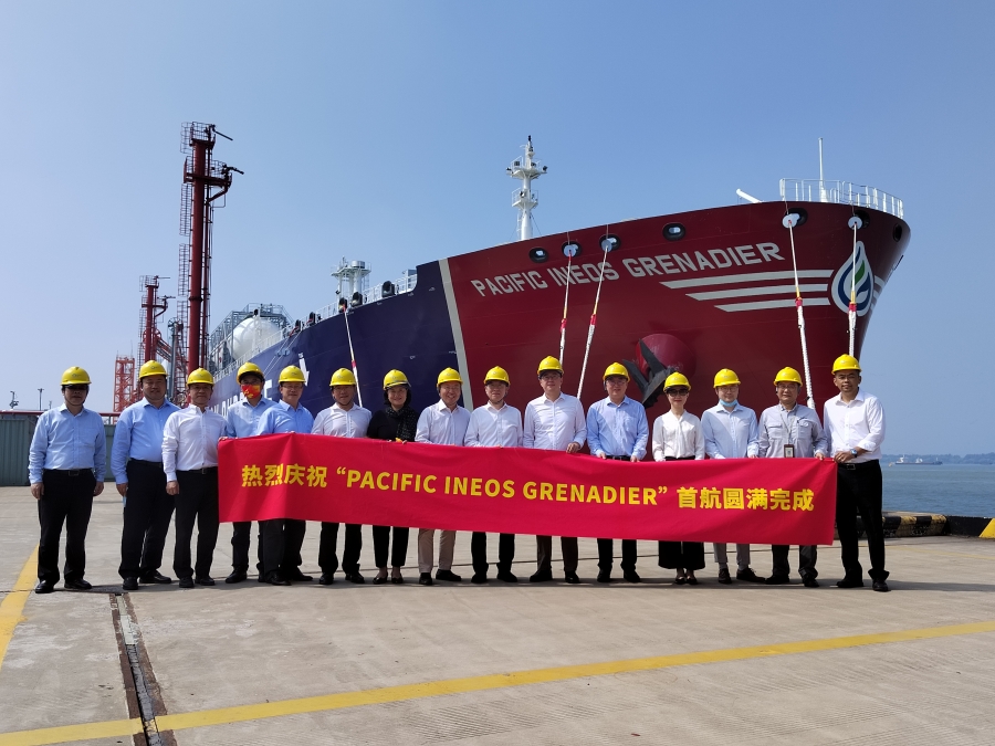 “Pacific Ineos Grenadier”輪于8月2日在江蘇泰興靠岸開始首次卸貨,8月4日卸完最后一批液化乙烷并空載離開港口。為順利完成“首航任務(wù)”,公司與租家、碼頭、船代等各方加強協(xié)調(diào)溝通,在7月初完成了首次裝貨和主機雙燃料試驗的所有項目,為首航任務(wù)的圓滿完成奠定了堅實基礎(chǔ)。