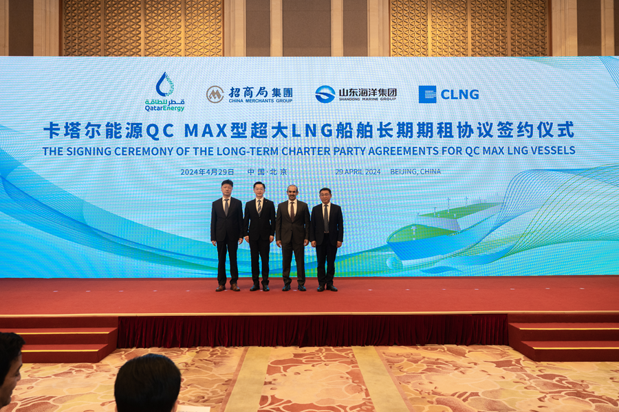 4月29日,山東海洋能源所屬山東海洋能源(新加坡)有限公司與卡塔爾能源(Qatar Energy)在北京釣魚臺國賓館簽署3艘QC MAX型超大LNG船舶長期期租協(xié)議,為其提供長期LNG運(yùn)輸服務(wù)??ㄋ柲茉词聞?wù)國務(wù)大臣、卡塔爾能源總裁及首席執(zhí)行官Saad Sherida Al-Kaabi,招商局集團(tuán)董事長繆建民,中國石油天然氣集團(tuán)副總經(jīng)理任立新,中國遠(yuǎn)洋海運(yùn)集團(tuán)副總經(jīng)理張勇,中國海洋石油集團(tuán)總經(jīng)理助理孫大陸,中化石油有限公司總經(jīng)理武文龍,山東海洋集團(tuán)董事長姜國棟,山東海洋集團(tuán)總經(jīng)理陳江光出席簽約儀式。卡塔爾能源事務(wù)國務(wù)大臣、卡塔爾能源總裁及首席執(zhí)行官Saad Sherida Al-Kaabi與山東海洋能源董事長、總經(jīng)理李茂忠簽署協(xié)議。