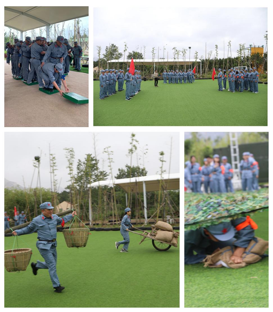 上午,參加團建活動的員工身穿紅軍裝,共同化身紅軍戰(zhàn)士,冒雨參與了穿越封鎖線、支援前線、朱德的扁擔、沼澤急行軍等長征體驗項目。通過親身參與體驗匍匐前進、推小推車、挑扁擔等項目,切身感受了老一輩共產(chǎn)黨人在惡劣環(huán)境中開展英勇革命斗爭的堅強意志力。