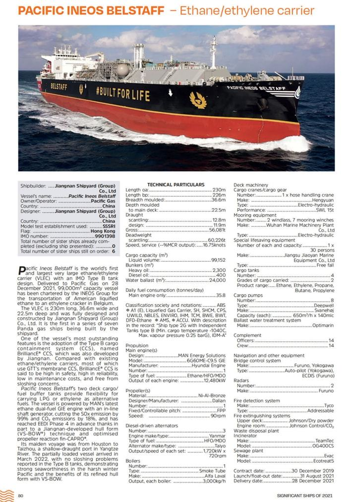 日前,英國皇家造船師學會發(fā)布《2021年度杰出船型的世界名船錄(Significant Ships of 2021)》,山東海洋能源旗下太平洋氣體船首艘 99,000立方米乙烷運輸船(VLEC)“PACIFIC INEOS BELSTAFF”輪(“貝達弗”輪)憑借其新穎的創(chuàng)新性和先進指標成功入選。