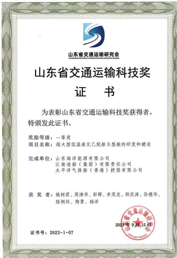 近日,山東省交通運(yùn)輸研究會(huì)發(fā)布了2023年度“山東省交通運(yùn)輸科技獎(jiǎng)”獲獎(jiǎng)項(xiàng)目的通知,經(jīng)評(píng)審委員會(huì)評(píng)審,公司牽頭完成的“超大型低溫液化乙烷船B型艙的研發(fā)和建造”項(xiàng)目成果榮獲一等獎(jiǎng)。