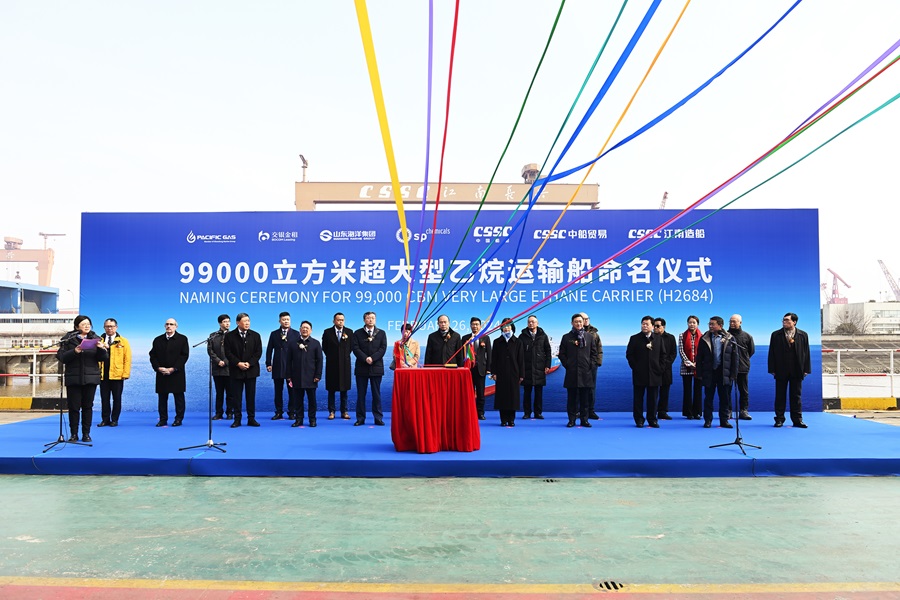 2月26日,山東海洋能源所屬第三艘99000立方米超大型乙烷運(yùn)輸船“Pacific SP Minerva”輪命名儀式在中國(guó)船舶集團(tuán)江南造船廠舉行,山東海洋集團(tuán)黨委書(shū)記、董事長(zhǎng)姜國(guó)棟,江南造船廠黨委副書(shū)記、總經(jīng)理肖文林,新加坡新浦化學(xué)有限公司行政總裁、新浦化學(xué)(泰興)有限公司董事長(zhǎng)曾憲相,交通銀行首席專(zhuān)家、交銀金租黨委書(shū)記、董事長(zhǎng)徐斌等出席儀式。公司黨委書(shū)記、董事長(zhǎng)、總經(jīng)理李茂忠出席活動(dòng)并致辭。新浦化學(xué)(泰興)有限公司副董事長(zhǎng)潘永美女士受邀擔(dān)任教母為該船命名。