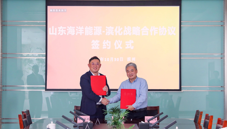 10月30日,山東海洋能源與濱化集團股份有限公司(以下簡稱濱化集團)舉行戰(zhàn)略合作協議簽約儀式。山東海洋能源黨委副書記、總經理孫德華與濱化集團輪值CEO、副總裁、濱化新加坡公司總經理蔡穎輝代表雙方簽署協議。